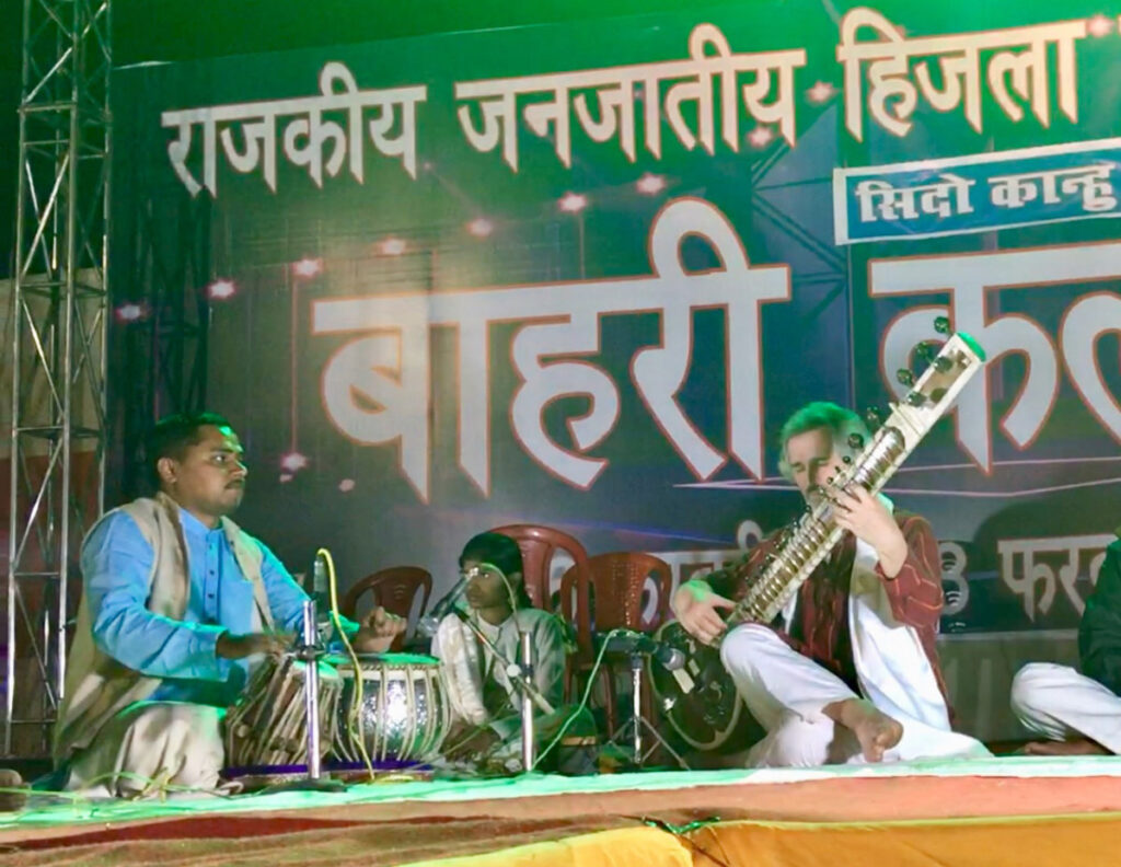 Translation: Playing Sitar in Book Fair On Tuesday in the Deoghar Book Fair and Cultural Festival, Mr. Uwe Neumann, a german national, played sitar. We were informed that in the year 2000 he played sitar on the ghat of the Ganges in Kashi (Varanasi). Shri Narendra Modi (now prime minister of India) organised the programme. H.H. the Dalai Lama also was present in the programme (details on page 4).